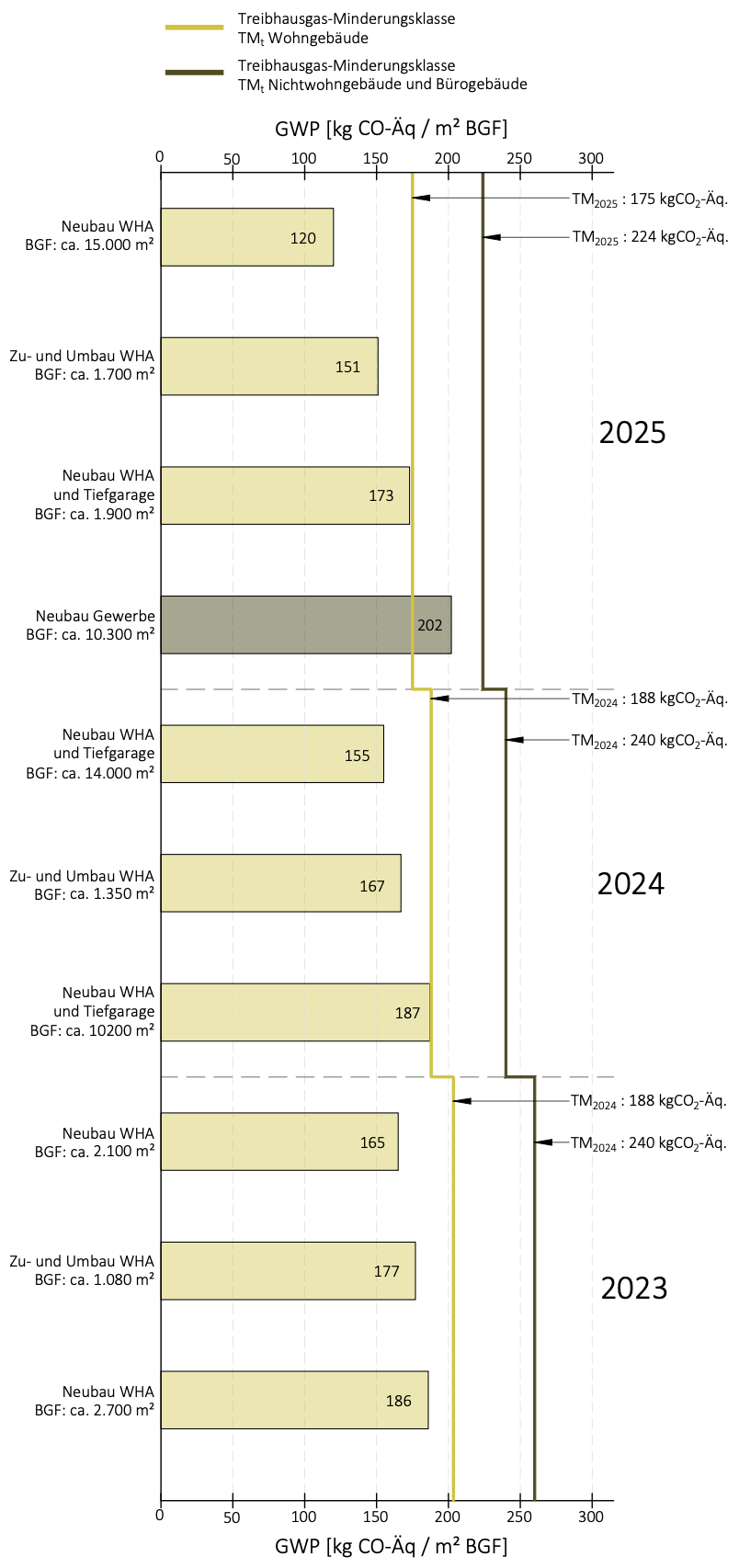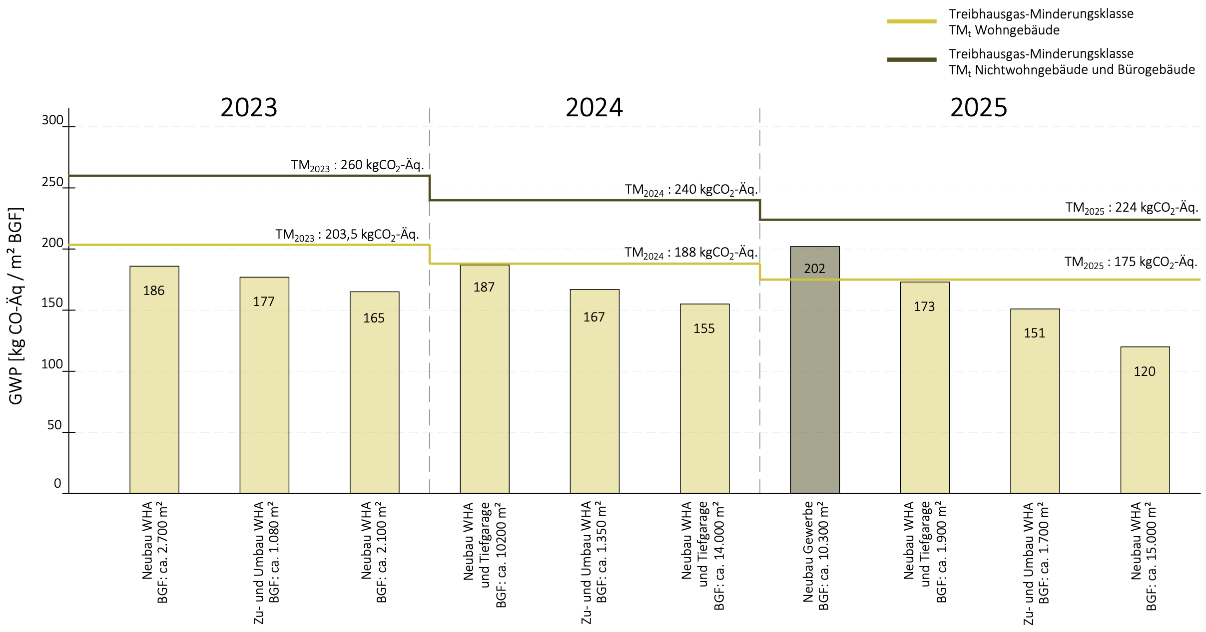 Die dargestellten Ökobilanzierungen basieren auf der DAfStb-Richtlinie „Treibhausgasreduzierte Tragwerke aus Beton, Stahlbeton oder Spannbeton“. Diese Richtlinie bezieht sich auf den deutschen Markt und ist in Österreich nur eingeschränkt übertragbar, da hier bislang keine vergleichbare Regelung existiert. Ziel der Richtlinie ist es, zulässige Grenzwerte für Treibhausgasemissionen (Global Warming Potential, GWP) von Tragwerken festzulegen und so einen Beitrag zur Erreichung der Klimaschutzziele zu leisten, ohne die Technologieoffenheit im Bauwesen einzuschränken. Bewertet werden die Emissionen aus Herstellung (A1–A3) und Entsorgung (C3–C4) von Beton-, Stahlbeton- und Spannbetontragwerken sowie von Bauteilen mit lastabtragendem Beton. Auf Basis des Referenzjahres 2020 (TM2020) definiert die Richtlinie zudem einen Treibhausgas-Reduktionspfad, der Grenzwerte im Kalenderjahr der Einreichung vorgibt und damit eine zeitliche Einordnung der zulässigen Emissionen ermöglicht.