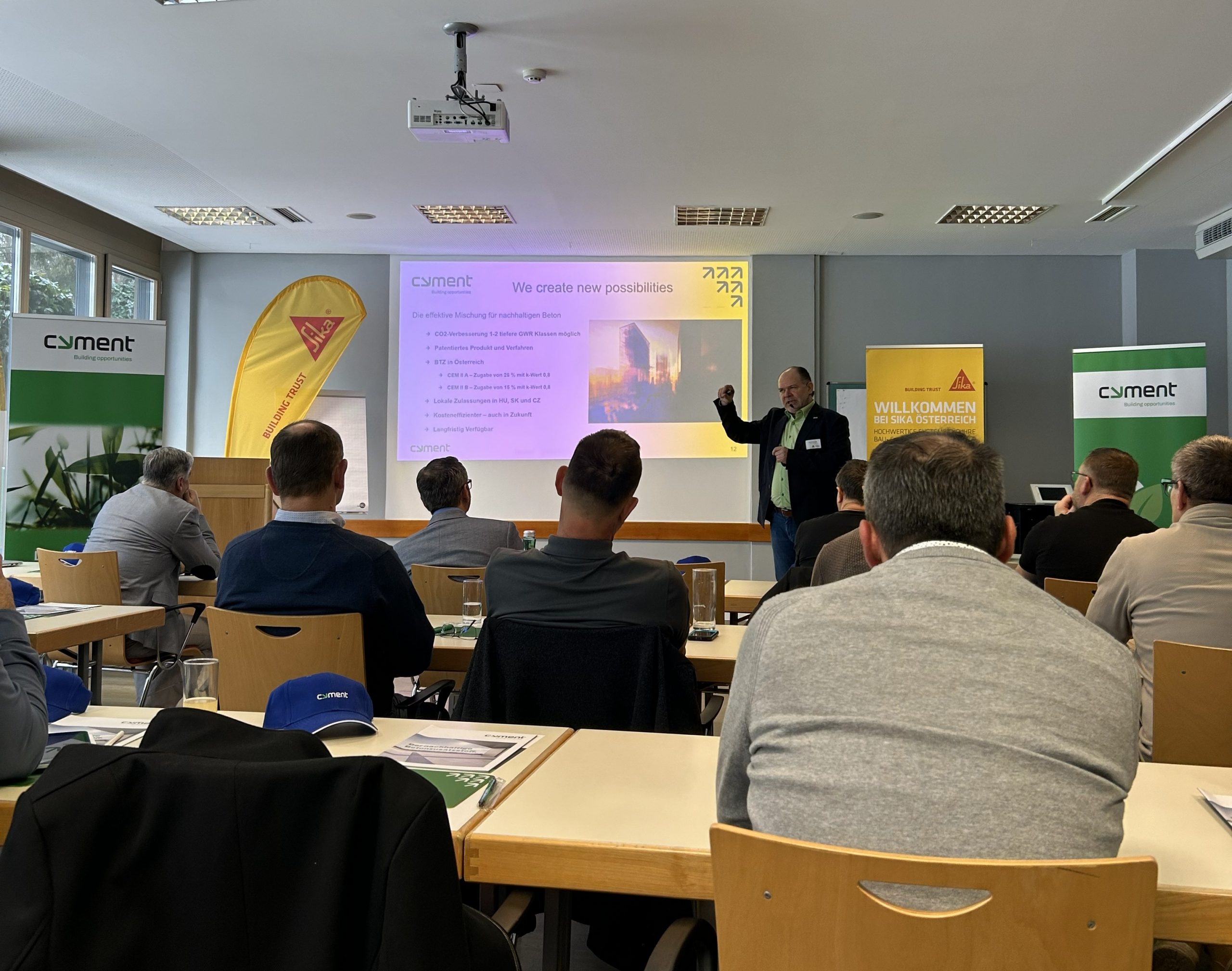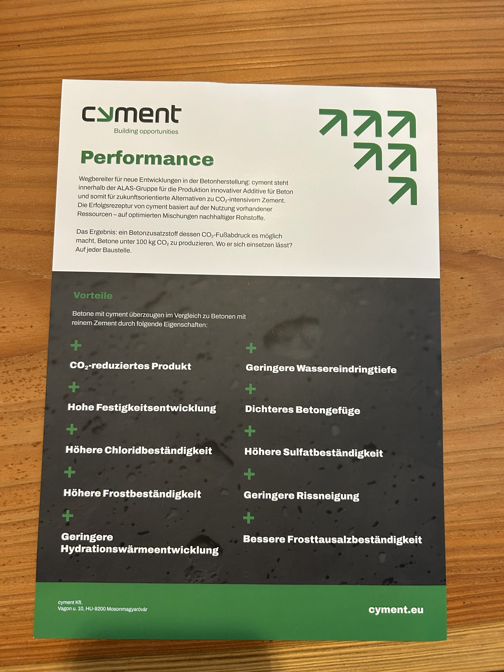 Ein zentrales Zukunftsthema stellte der Vortrag von Markus Kronegger (Cyment Kft.) dar. Vorgestellt wurde ein bereits zugelassener Betonzusatzstoff (Cyment), der mittelfristig eine Reduktion der CO₂-Emissionen auf unter 100 kg CO₂-Äquivalent pro Kubikmeter Beton ermöglichen wird. Die vorgestellten Entwicklungen zeigen eindrucksvoll, welches Potenzial in alternativen Bindemittelsystemen für die kommenden Jahre liegt.